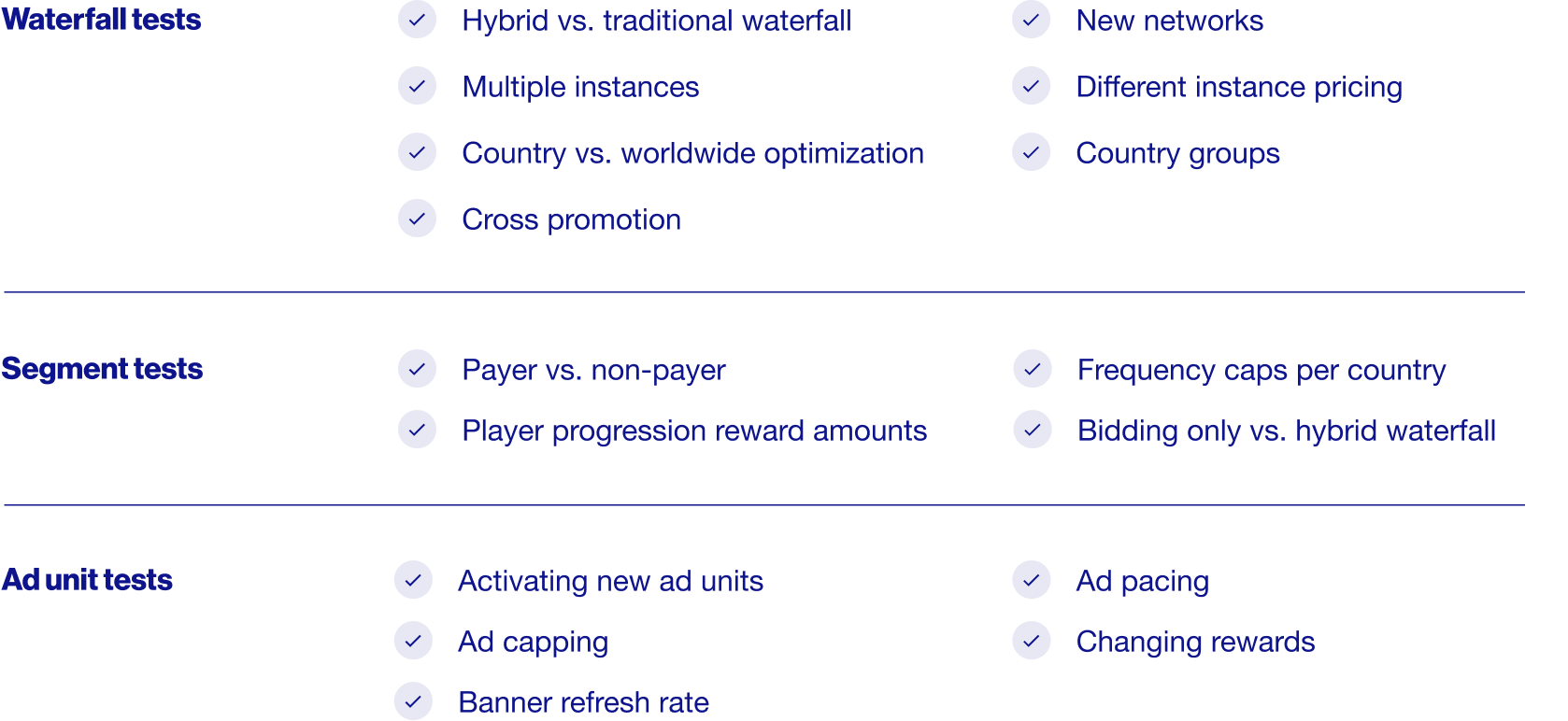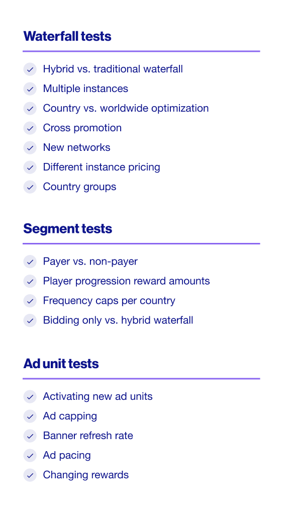 Supporting various tag types like VAST, hosted, MRAID, and IMA, ironSource gives you full control over your direct-sold campaigns, which run inside your in-app bidding stack – including capping, pacing, targeting capabilities, and more.