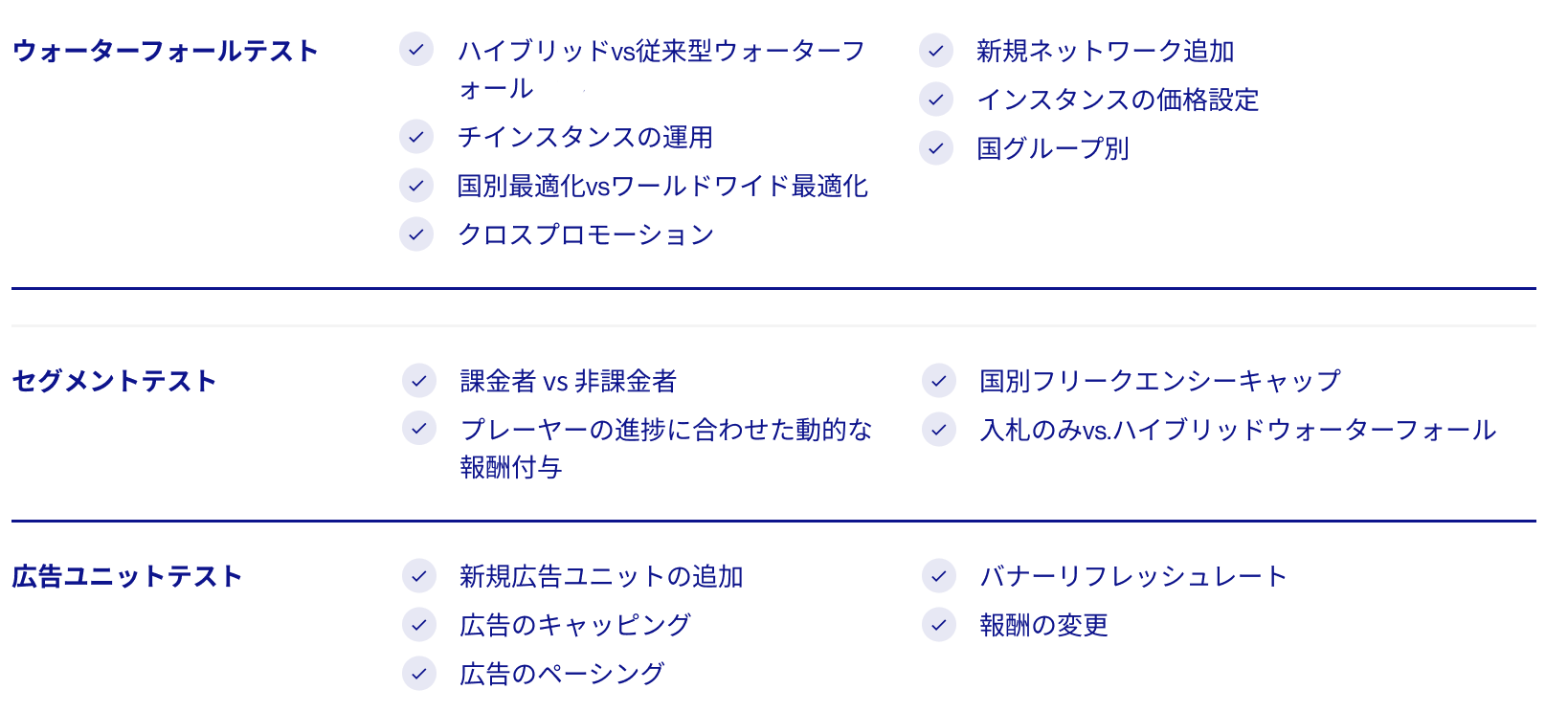 各広告ソースが正しく設定されているか、広告が正常にロードされているか、ロード後に広告が表示されるかなど、モバイルのテストデバイスから直接確認。テストデバイスとinitレスポンスパラメーターに応じて、規制設定、アプリキー、バンドル詳細なども表示します。