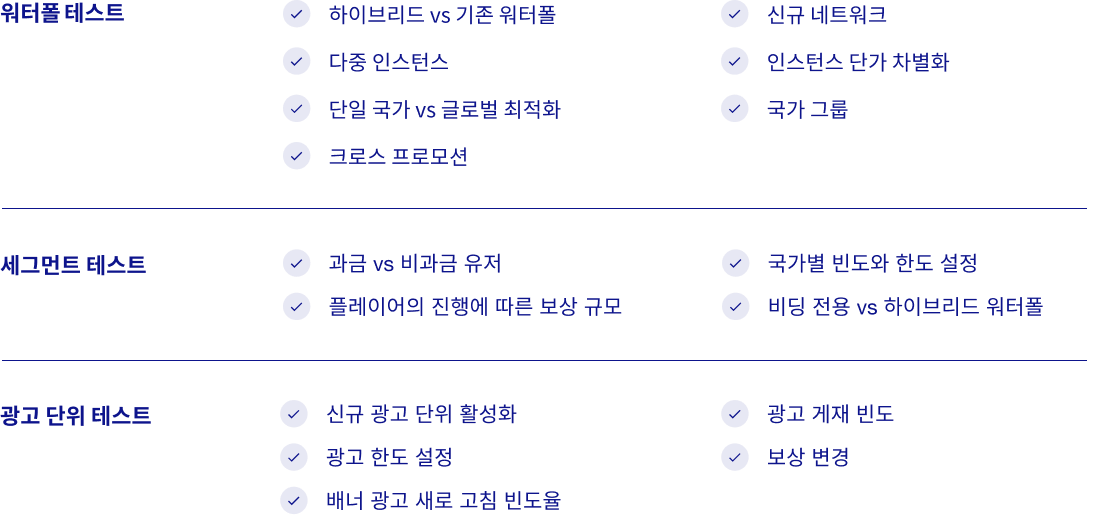 원하는 때에 테스트의 광고 유닛을 바로 추가하거나 특정 광고의 테스트를 중지하는 등 보다 높은 유연성으로 앱 성과를 최적화할 수 있습니다.